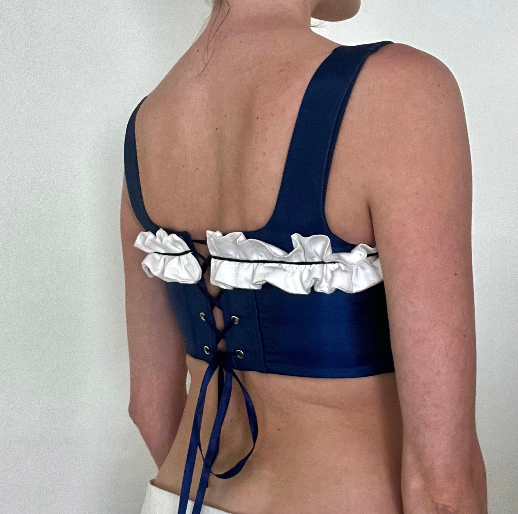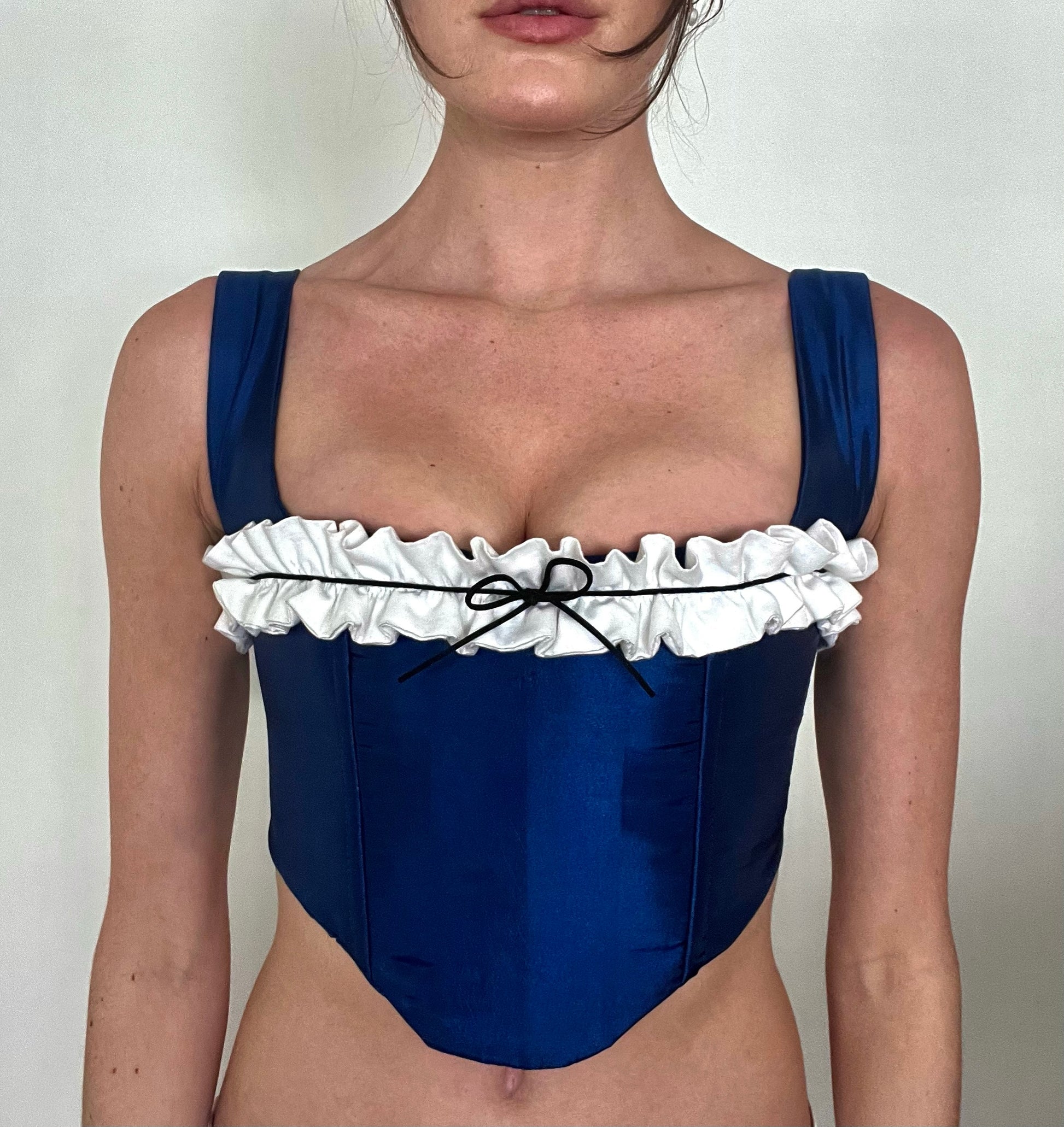 The Bells corset is a one-of-a-kind top featuring a curved neckline and hem sitting above the waist, boning and an adjustable lace up back closure. This top has a gathered ruffle detail with a dainty black bow to tie it together.