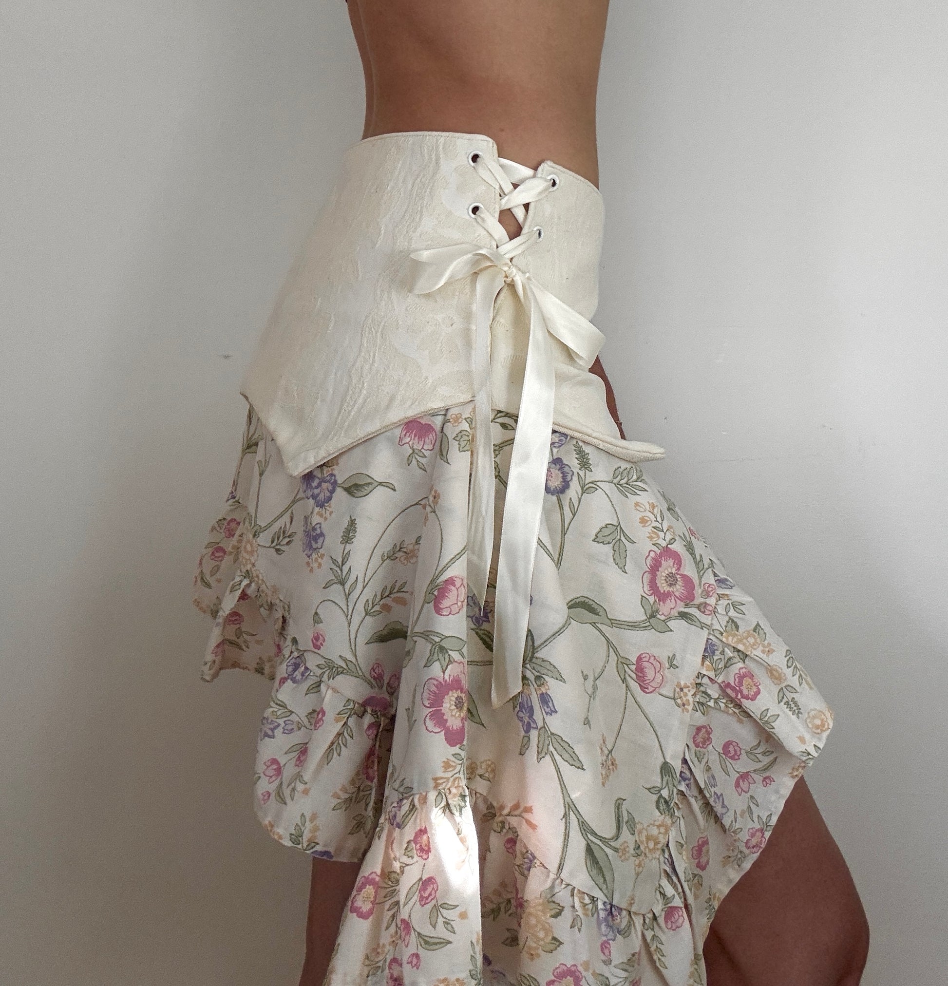 This up-cycled skirt is a flirty mini that can be worn mid or low rise. It is completely adjustable with side tying bows and an asymmetric gathered skirt.