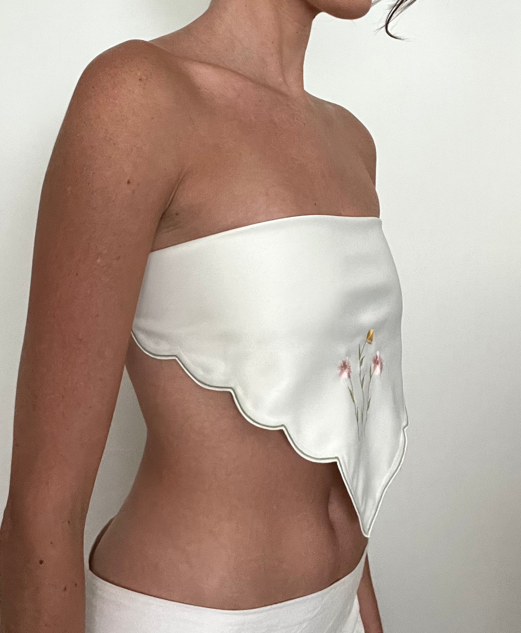A flirty and fun top. Light weight with tie around back, scalloped hemline and embroidered flowers. This style fits a S/M in size