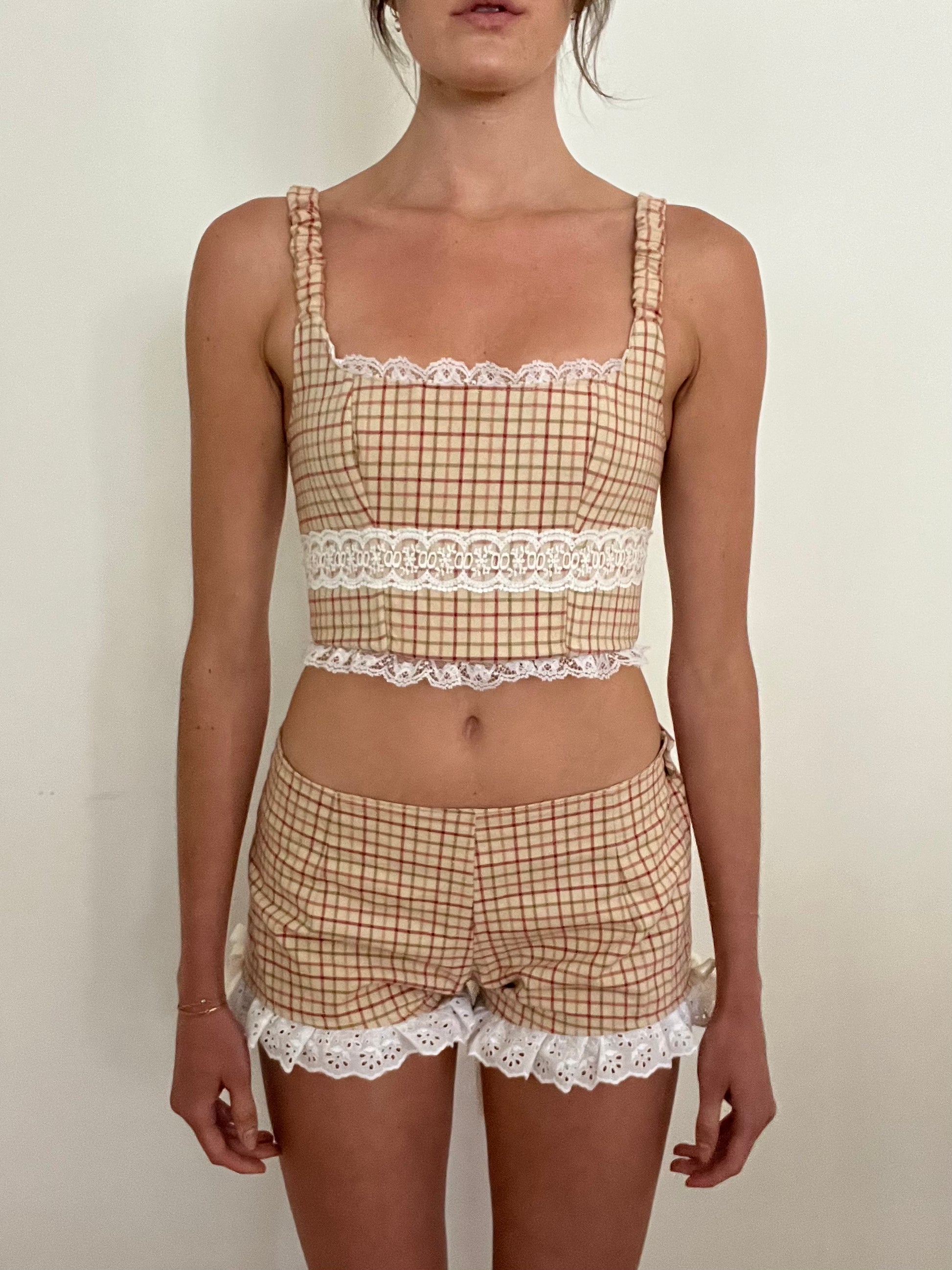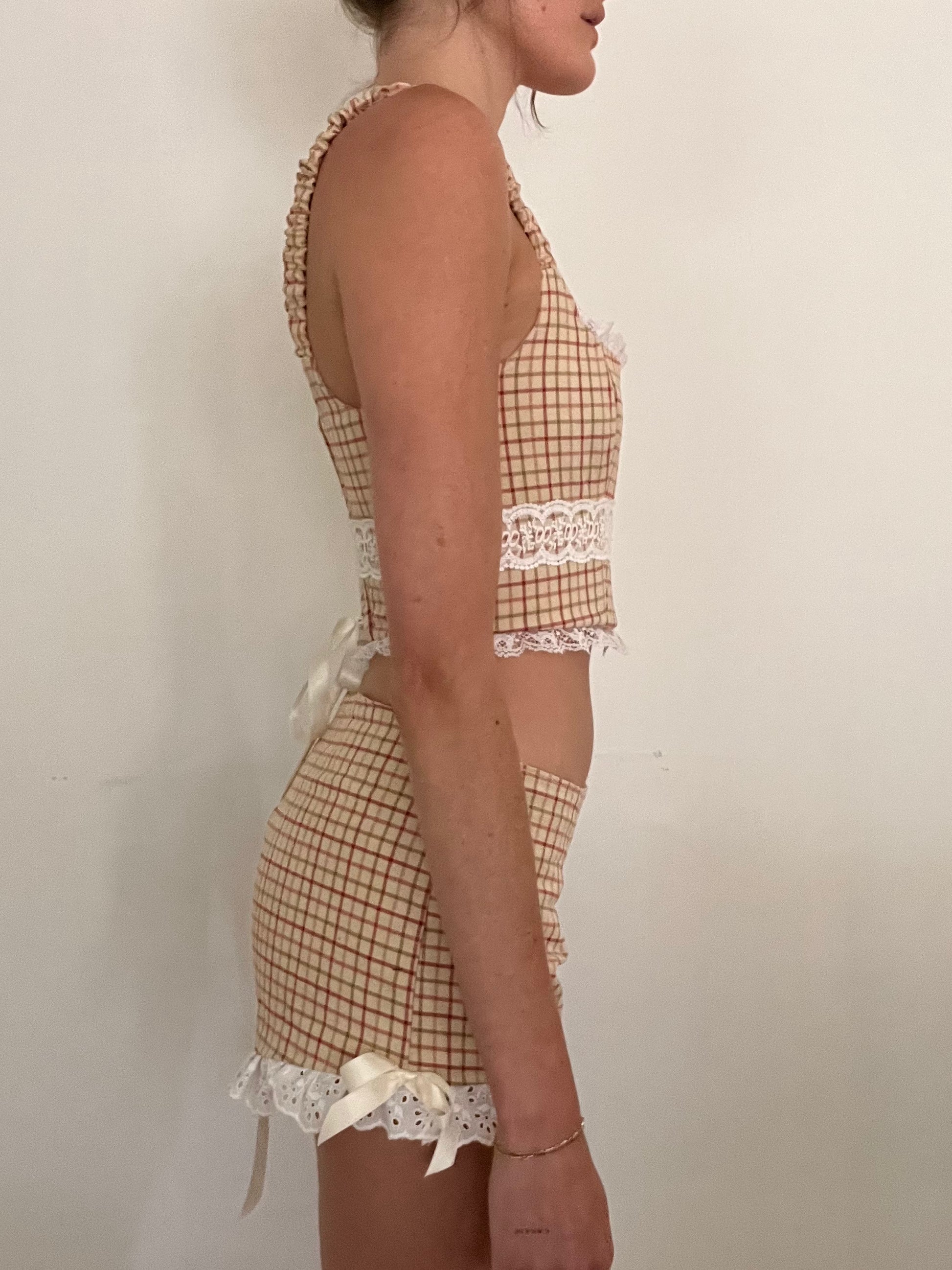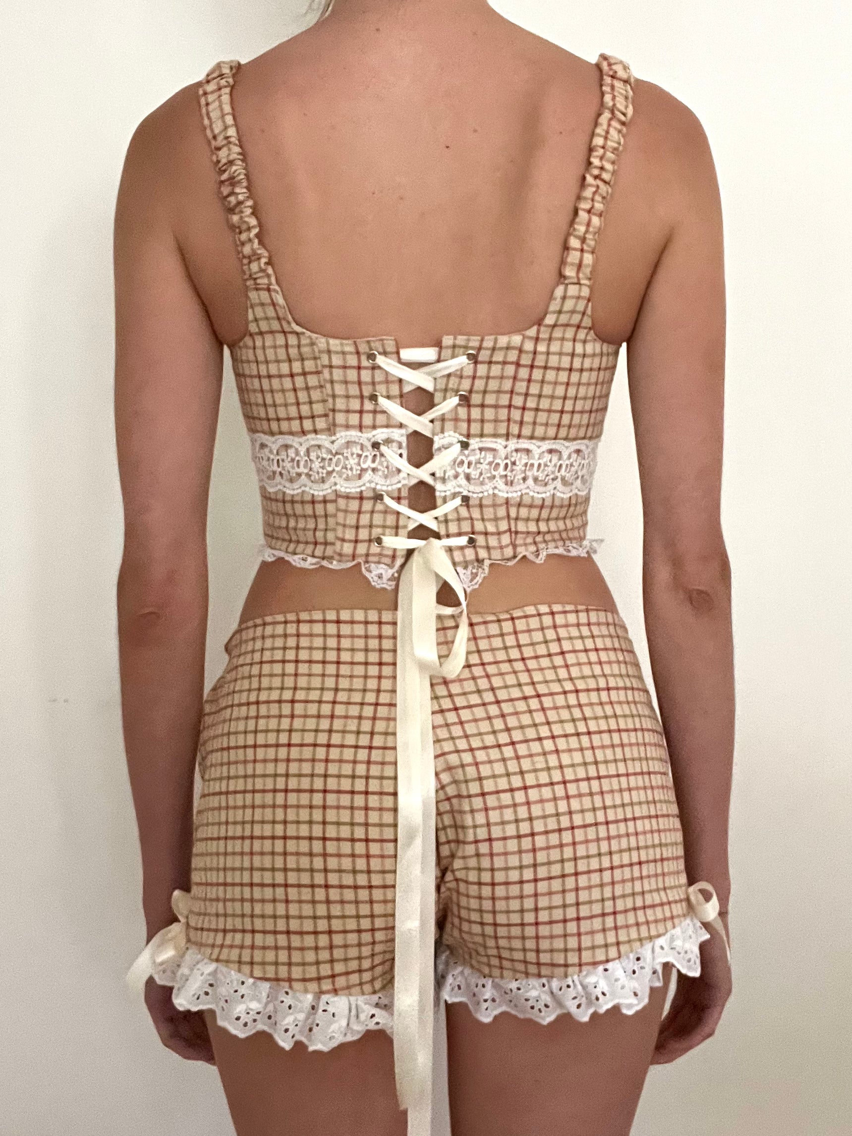 The Dukes short is designed to be the perfect pair to your corset top. Sitting comfortably on your mid waist for a perfect set look. Finished with a lace hem, bows detailing with a button up side seam closure.