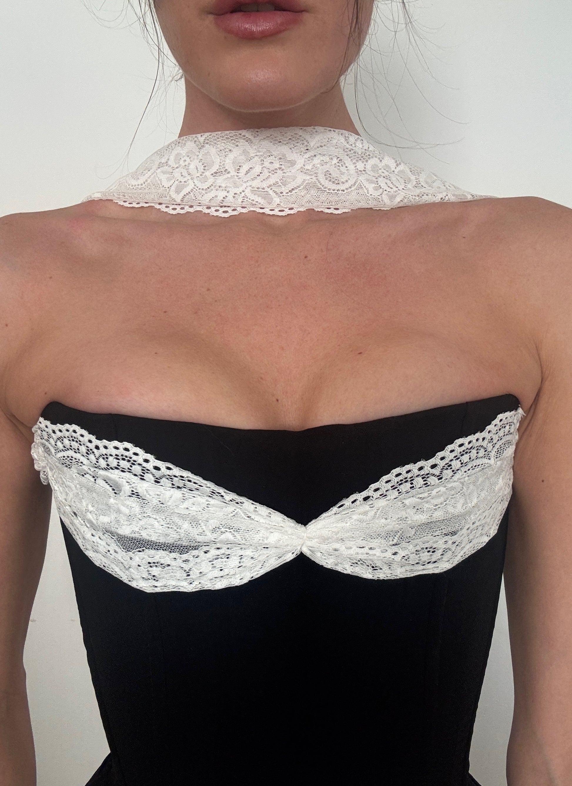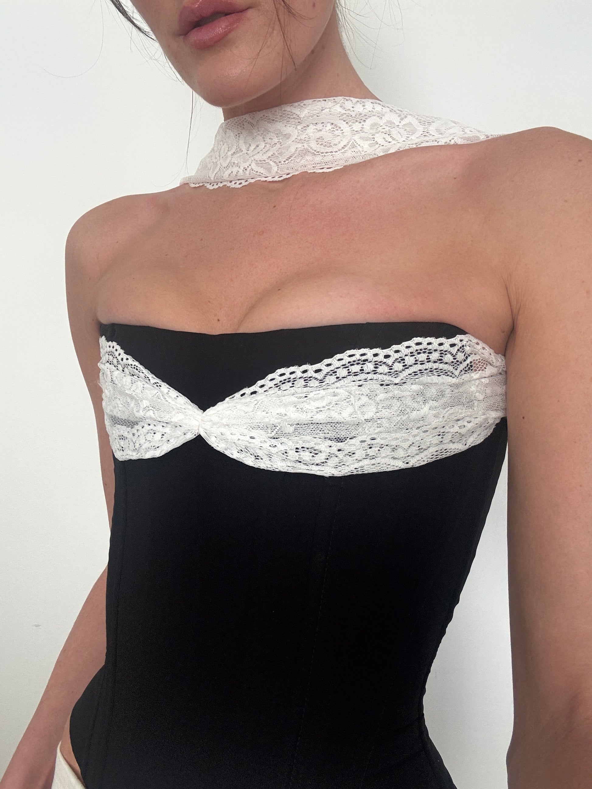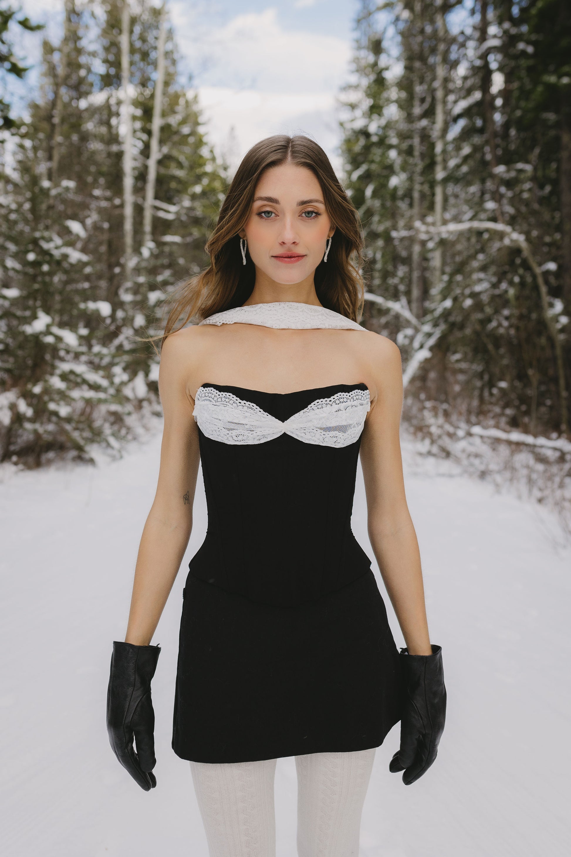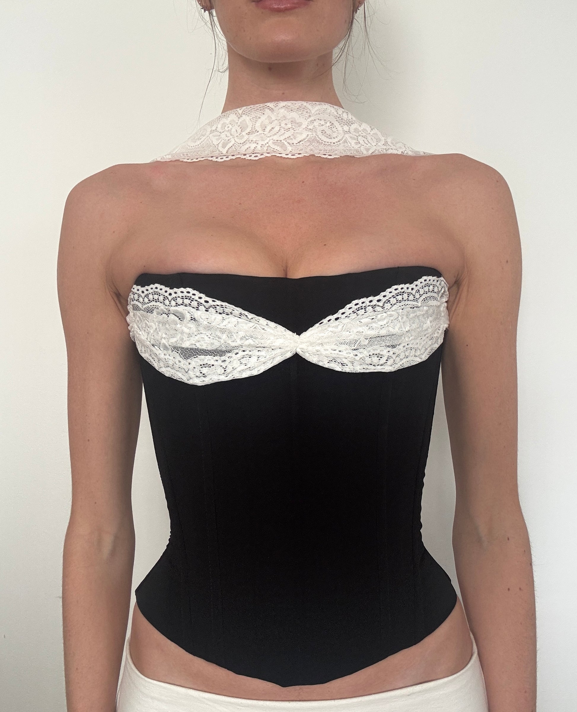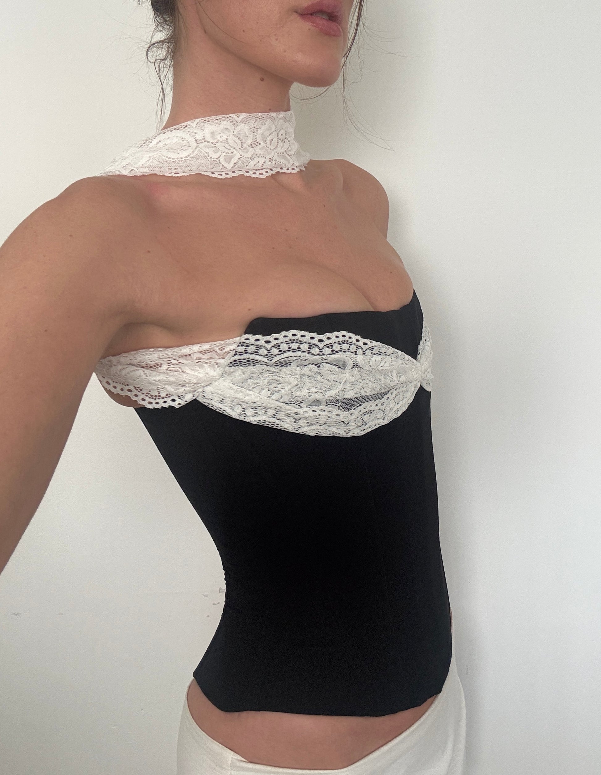 The Celeste is a timeless peaked style strapless corset. This top sits just over your hips accentuating the wearers figure cinching the waist. with boning and a back adjustable lace up closure. This corset has a stretch lace detailing worn around the neck adding an elegant flare.