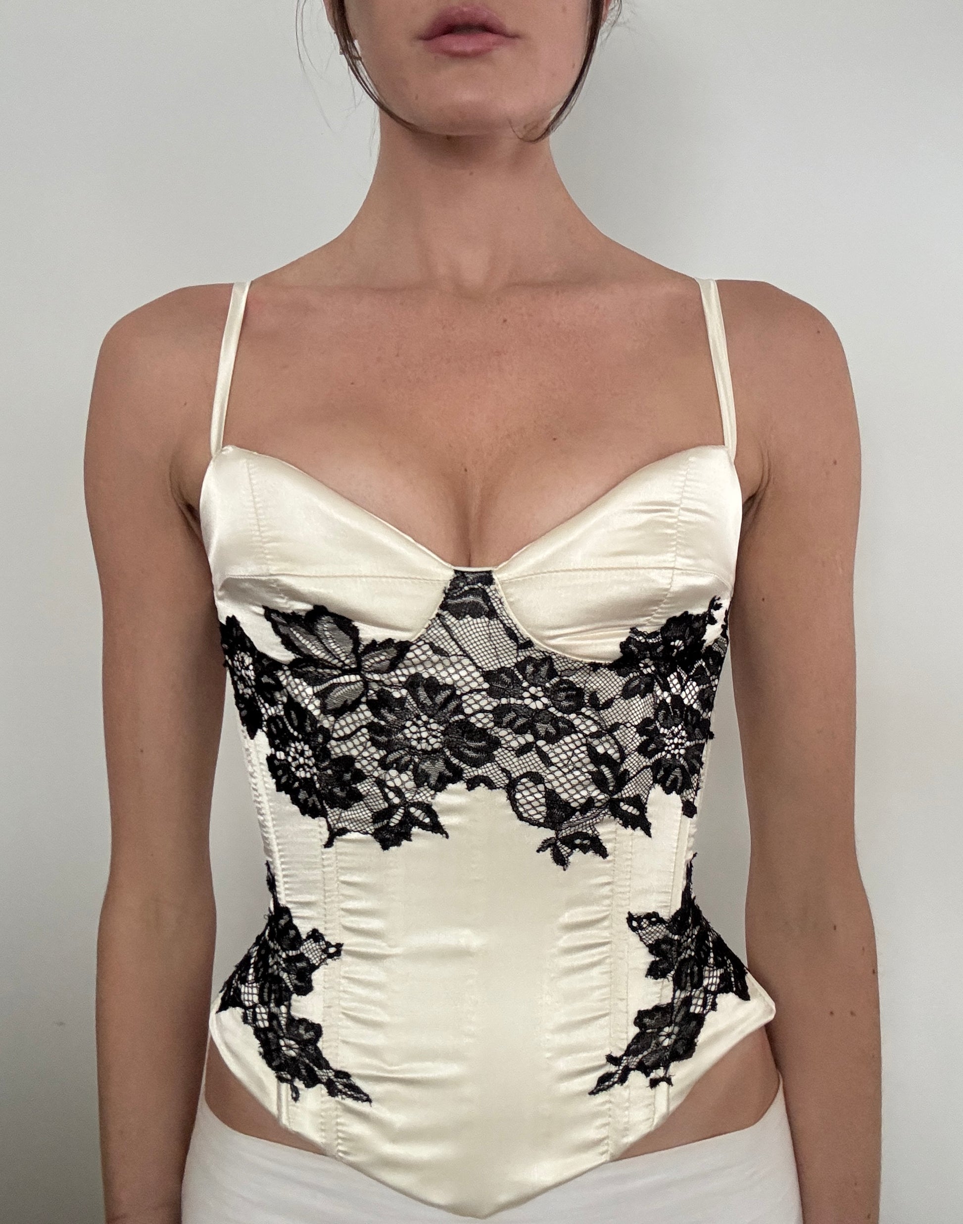 The Evangeline corset is a stunning sweetheart cup style strap top. It is made with padded contoured cups and boning throughout the bodice for support. This corset has hand sewn black lace detailing and adjustable straps. The curved hemline accentuates the natural curves of the body and had an adjustable back closure.