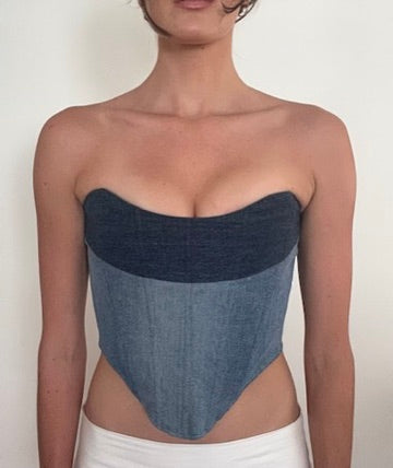 The Hazel corset is a strapless style top featuring a curved neckline and hem, boning and an adjustable lace up back closure.