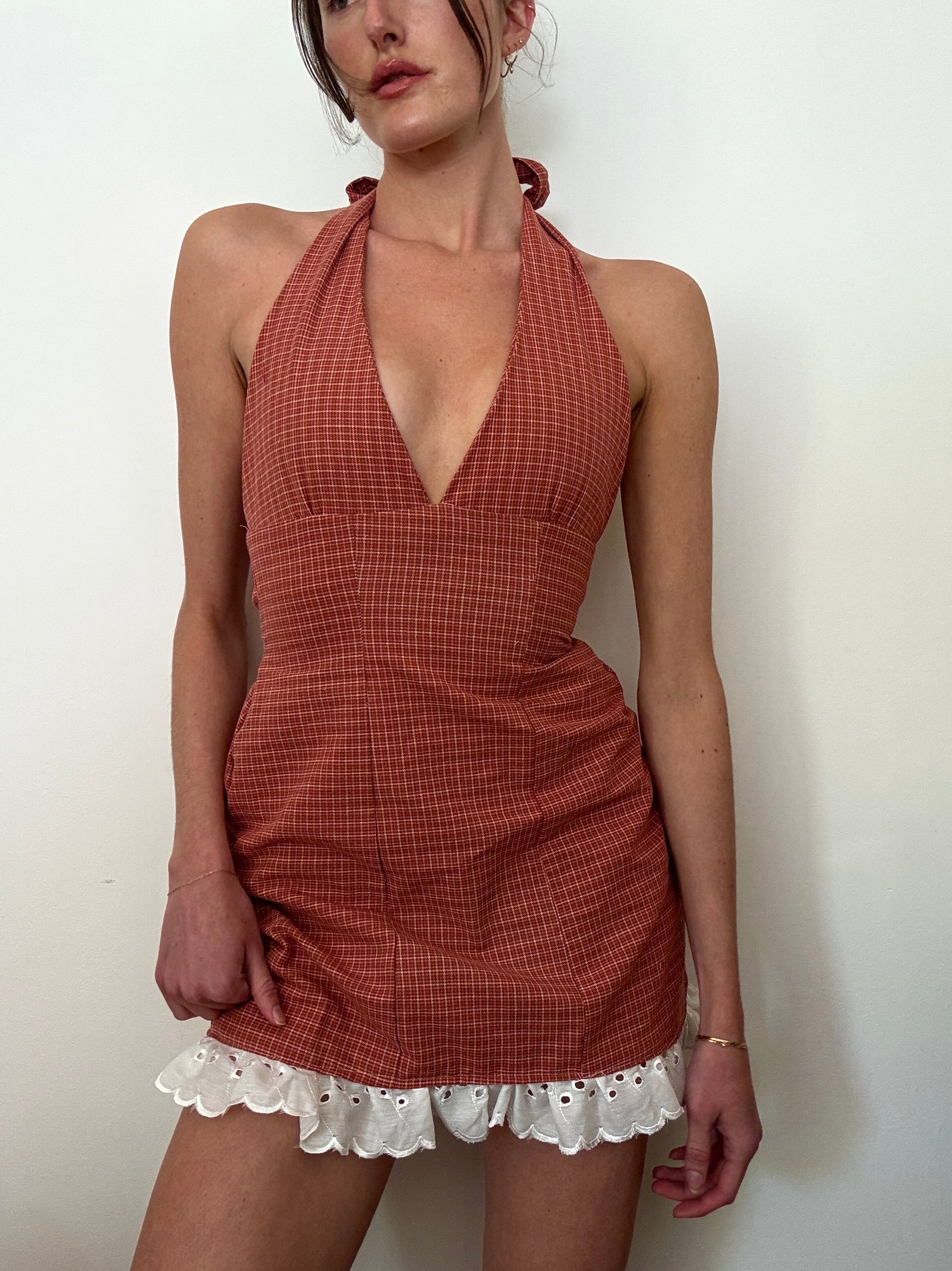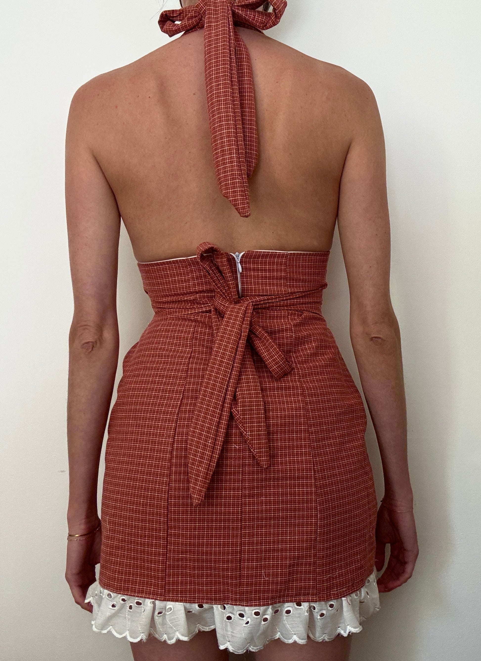 The Josie Dress is a flirty lightweight Spring/Summer mini dress. This dress has a flattering halter neck and adjustable waist tie to bring in the wearers figure. The Josie dress is fully lined with an invisible zipper and gathered frill hem.