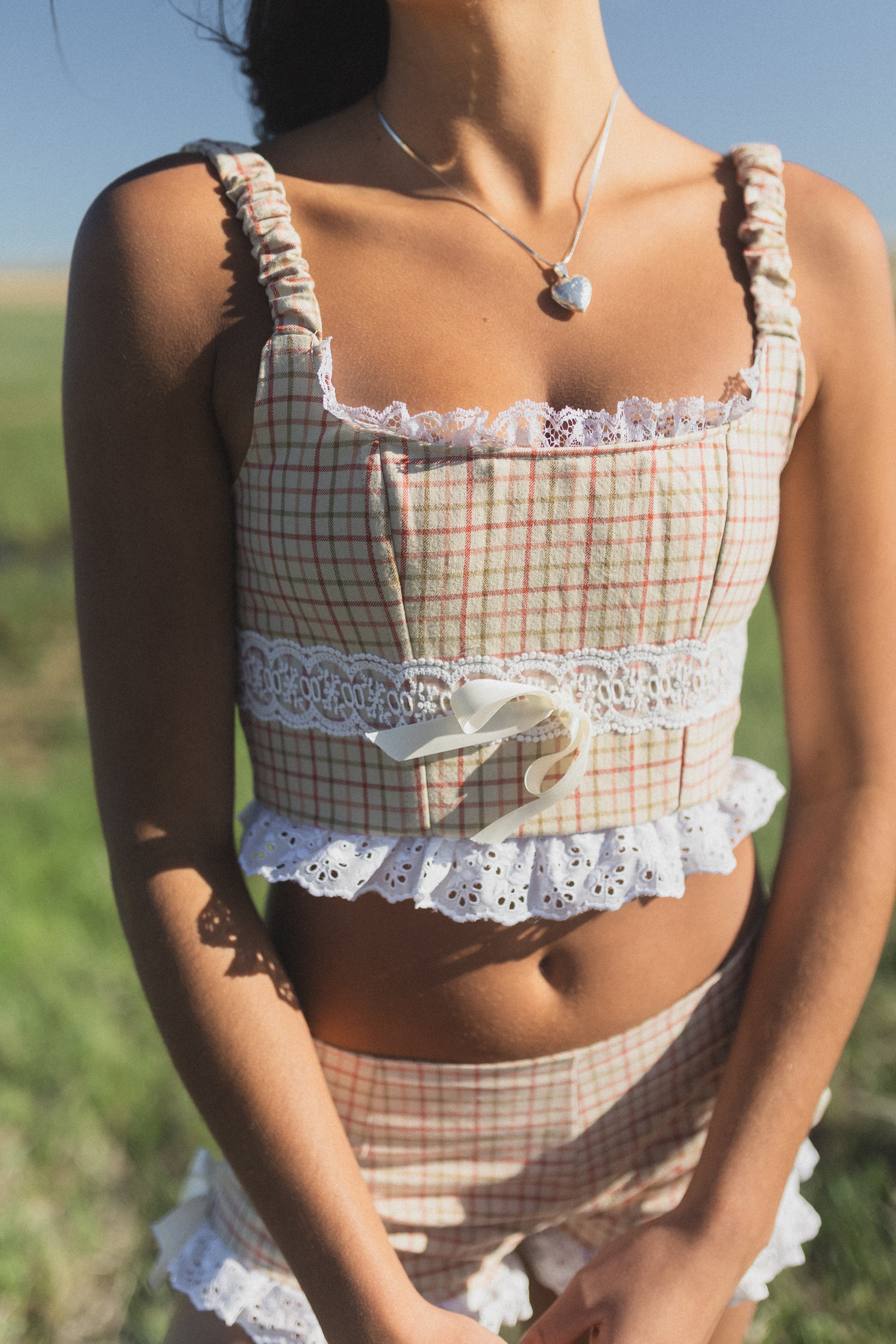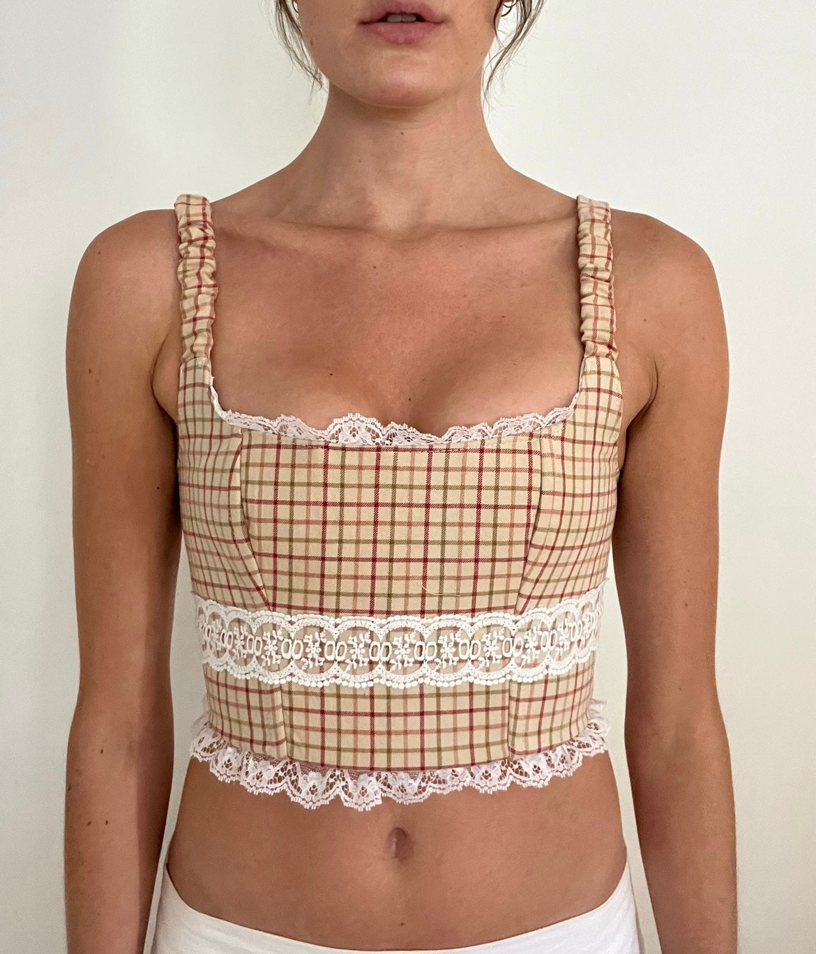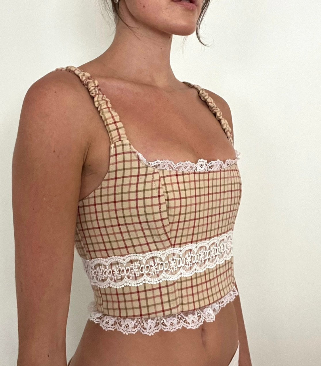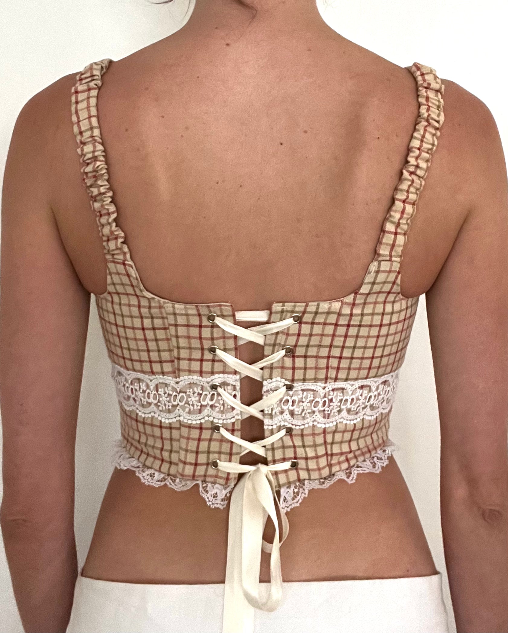 The Lucy corset is an elastic strap style top featuring a curved neckline and hem sitting at the waist, boning and an adjustable lace up back closure. This top also has lace detailing at the neckline, under the bust, and the hem.