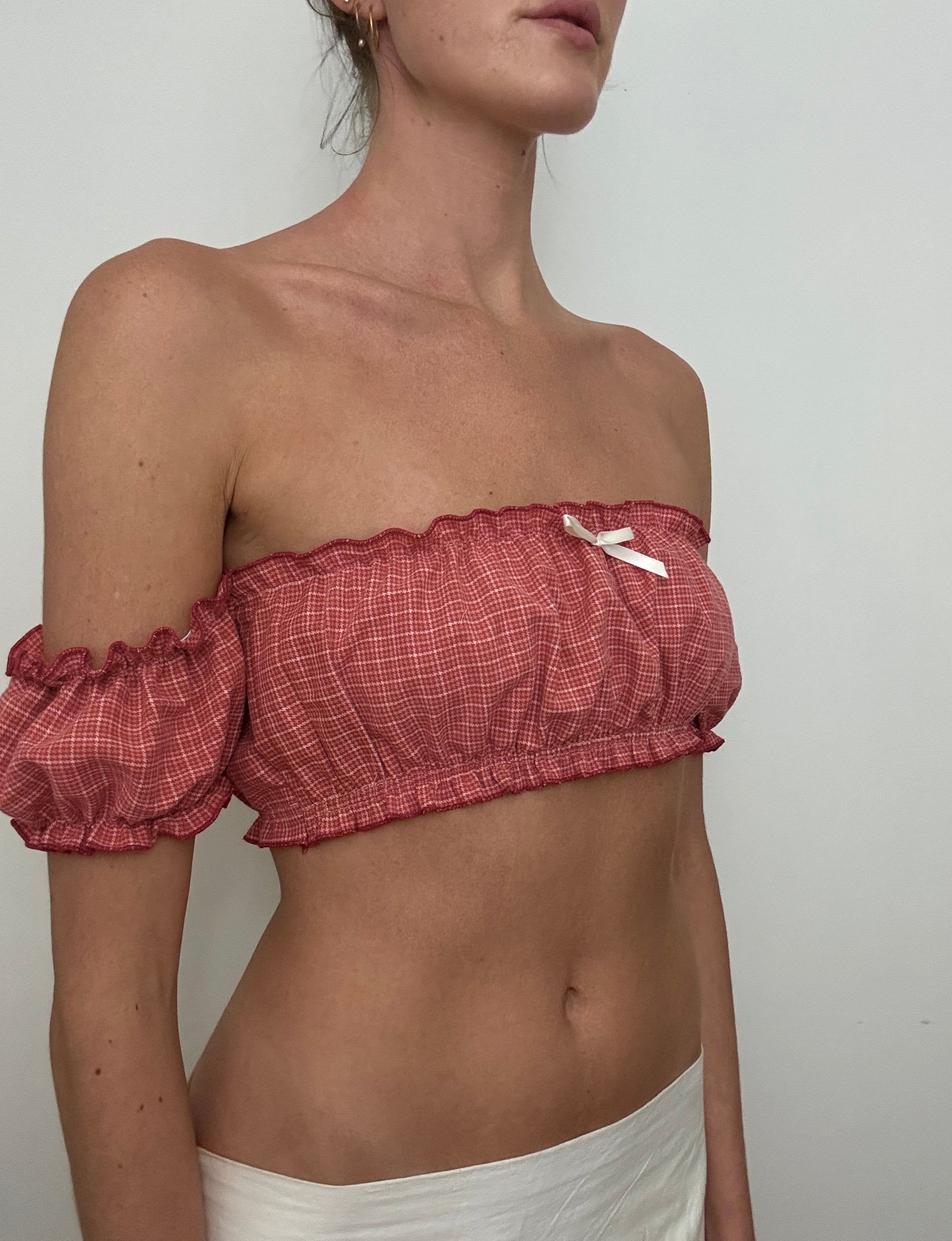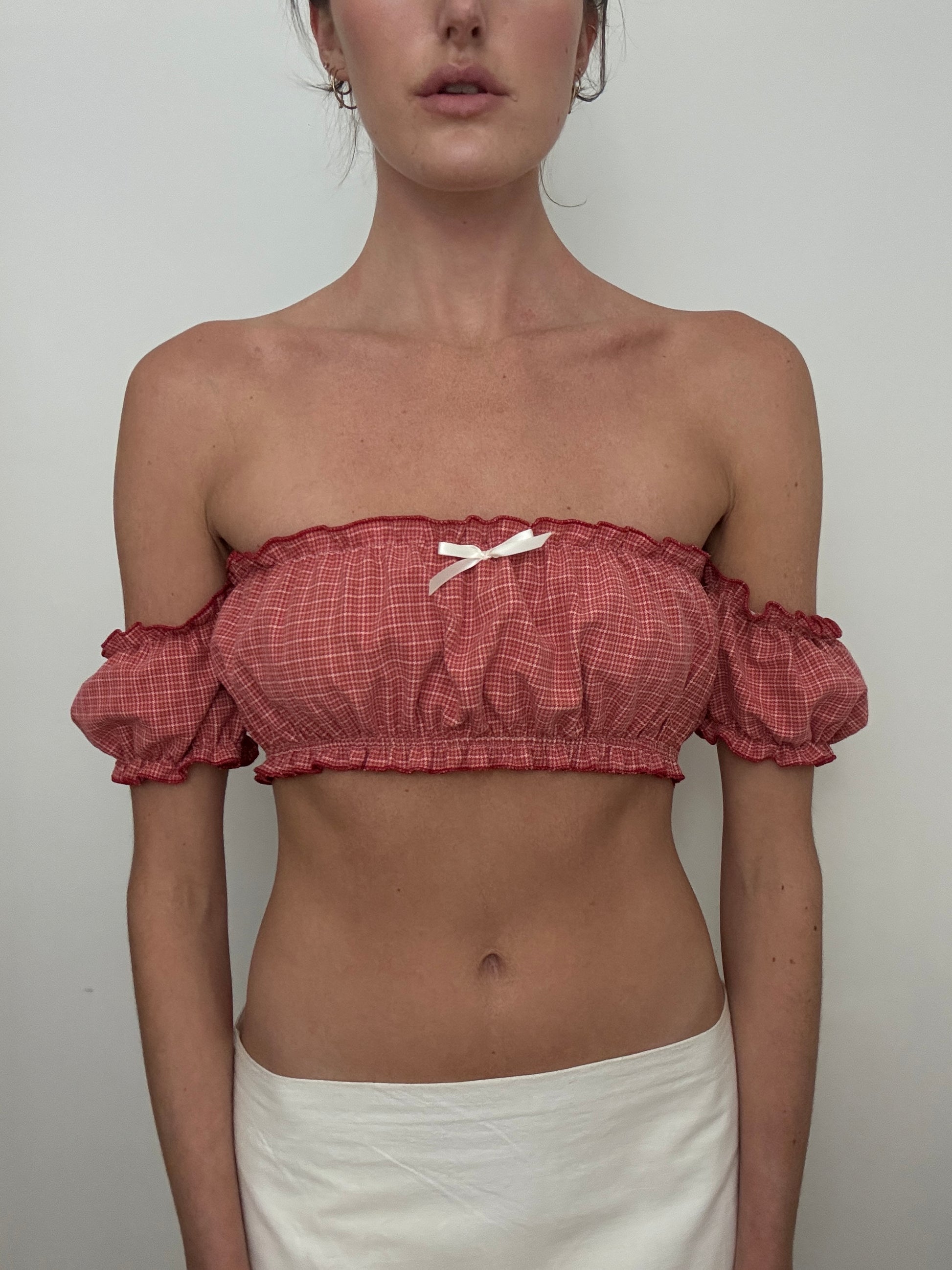 A cutesy off the shoulder scrunch soft top with a little bow detail. Available in white or red gingham and made with elastic gathers to stay in place!
