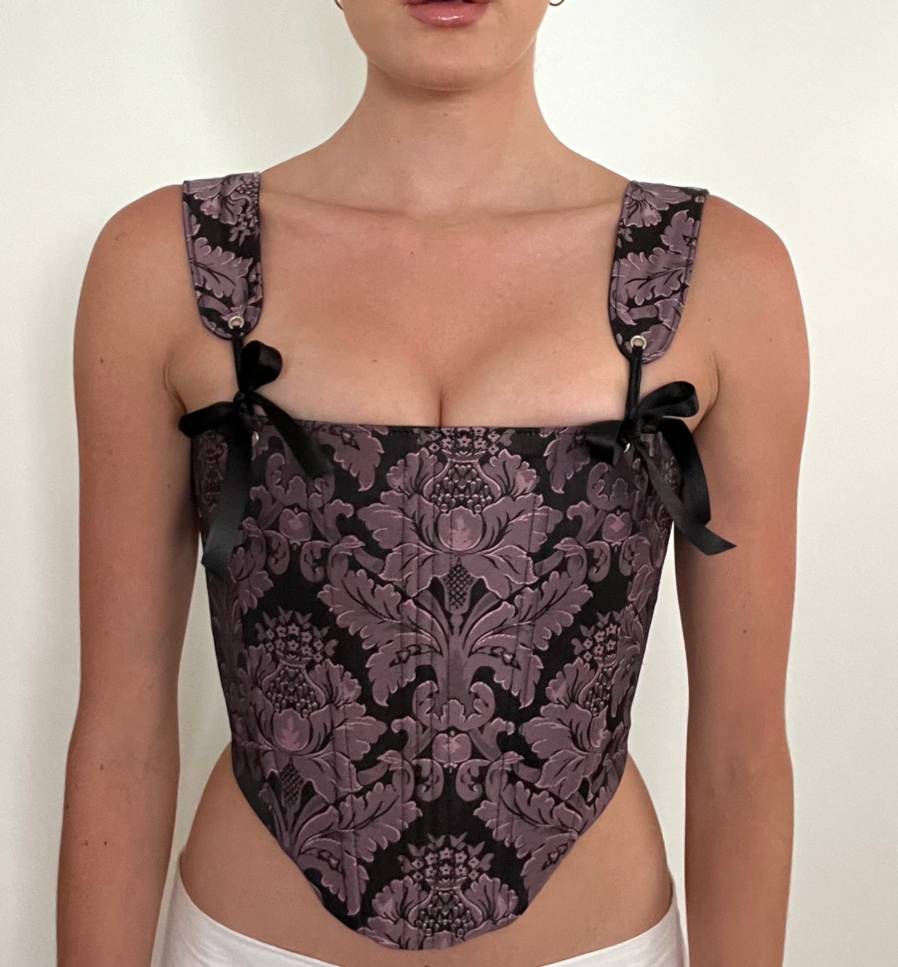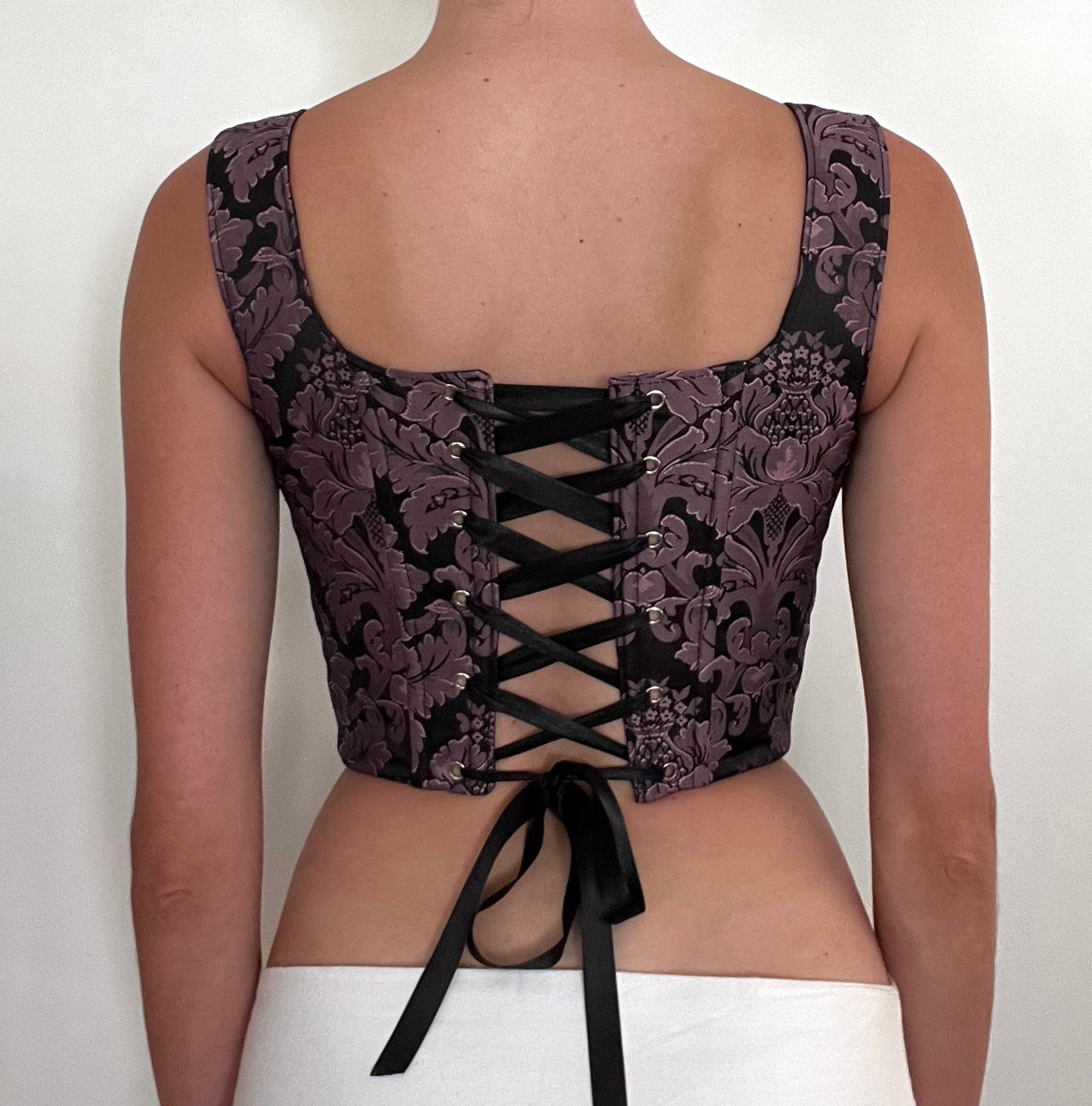 The Sloane corset is a mid length corset that sits at the waist with a flattering curved hem and straight neckline. This top has adjustable front tying straps, boning, and an adjustable back closure.