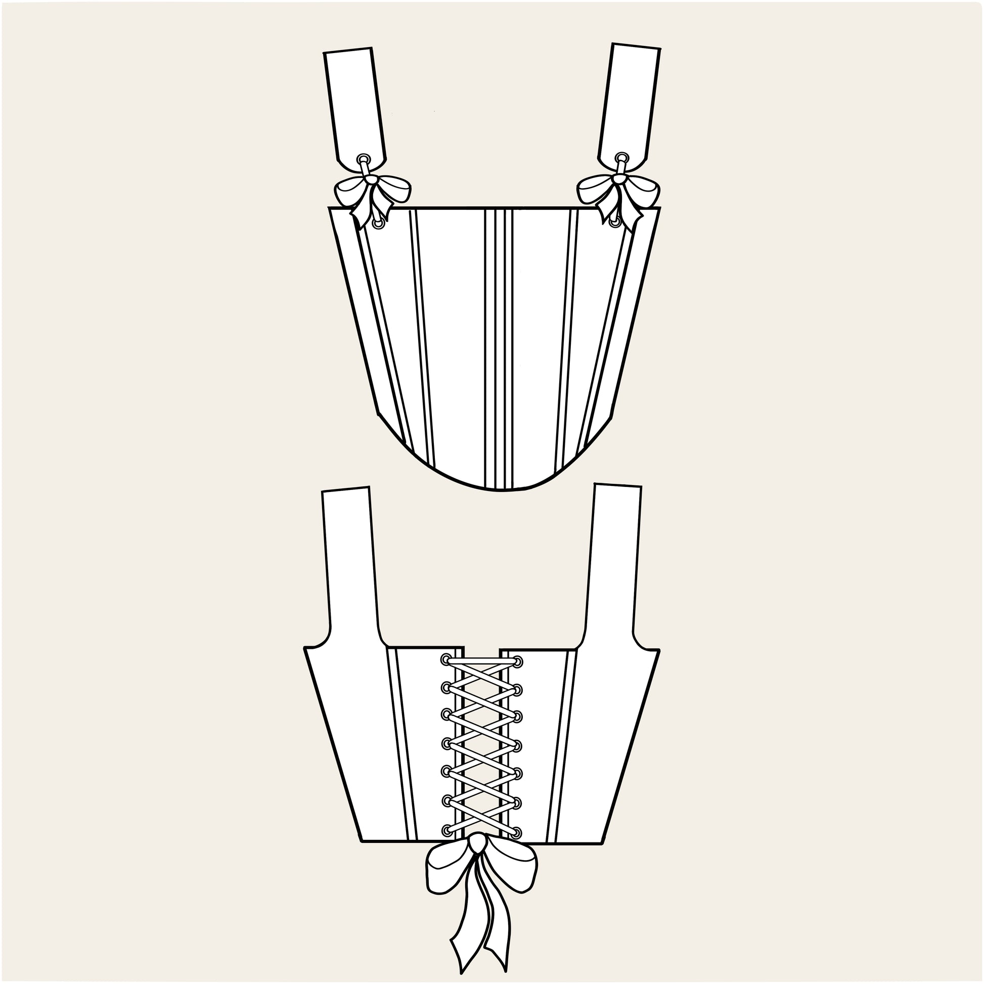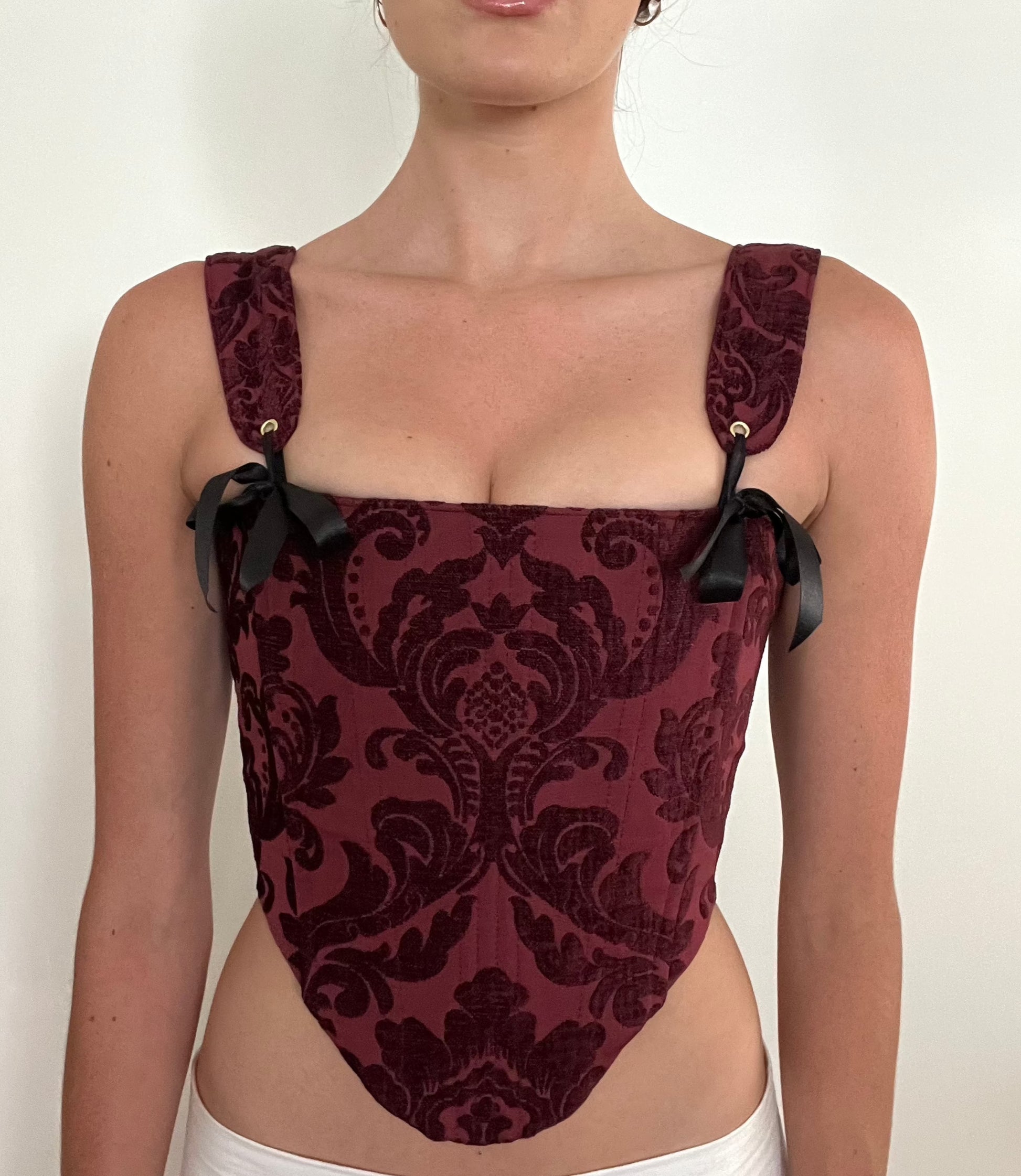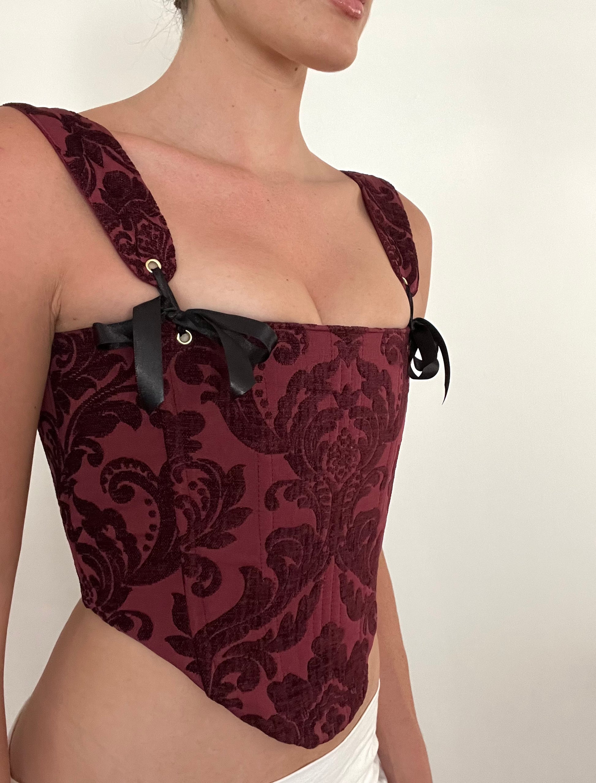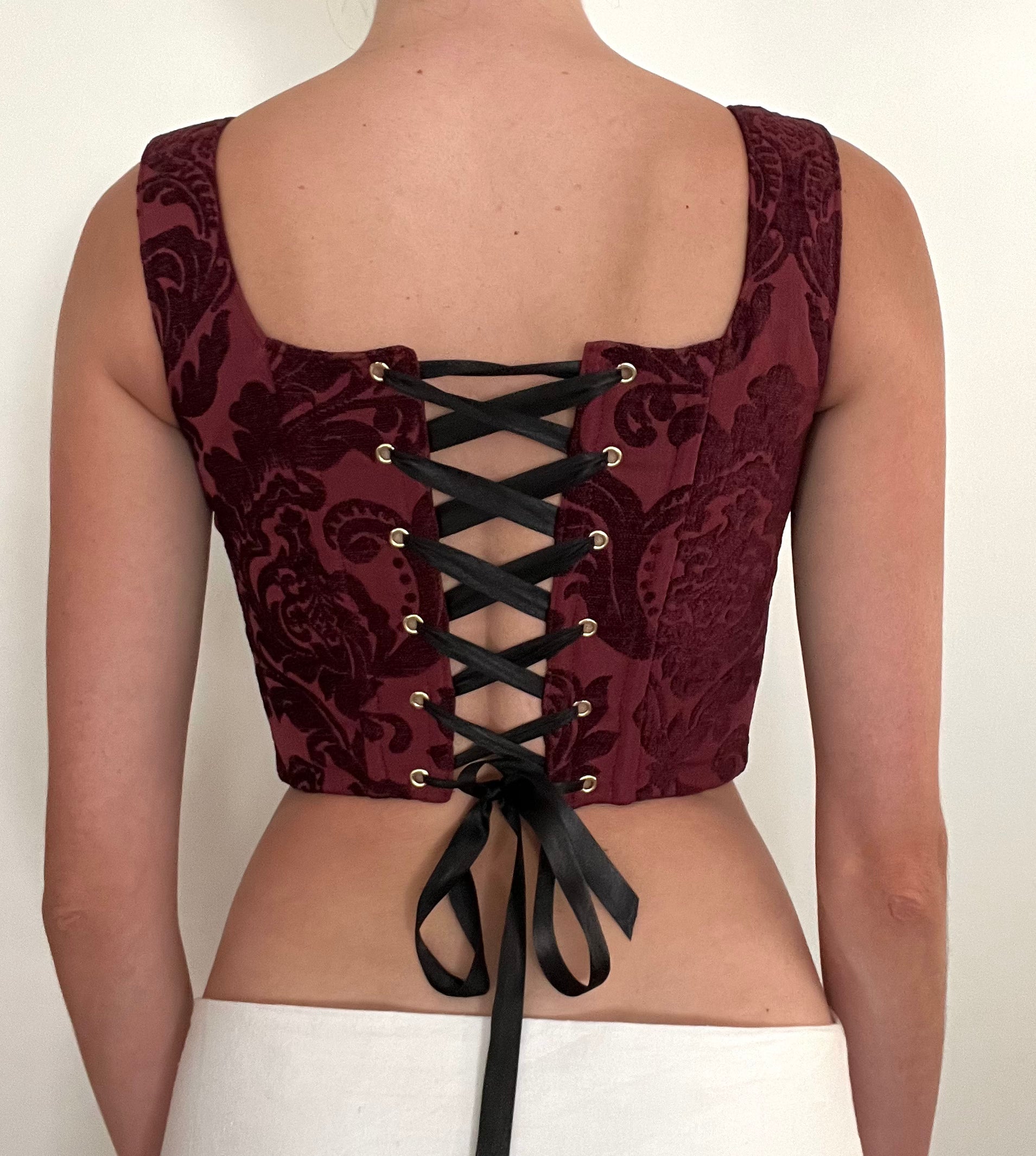The Sloane corset is a mid length corset that sits at the waist with a flattering curved hem and straight neckline. This top has adjustable front tying straps, boning, and an adjustable back closure.