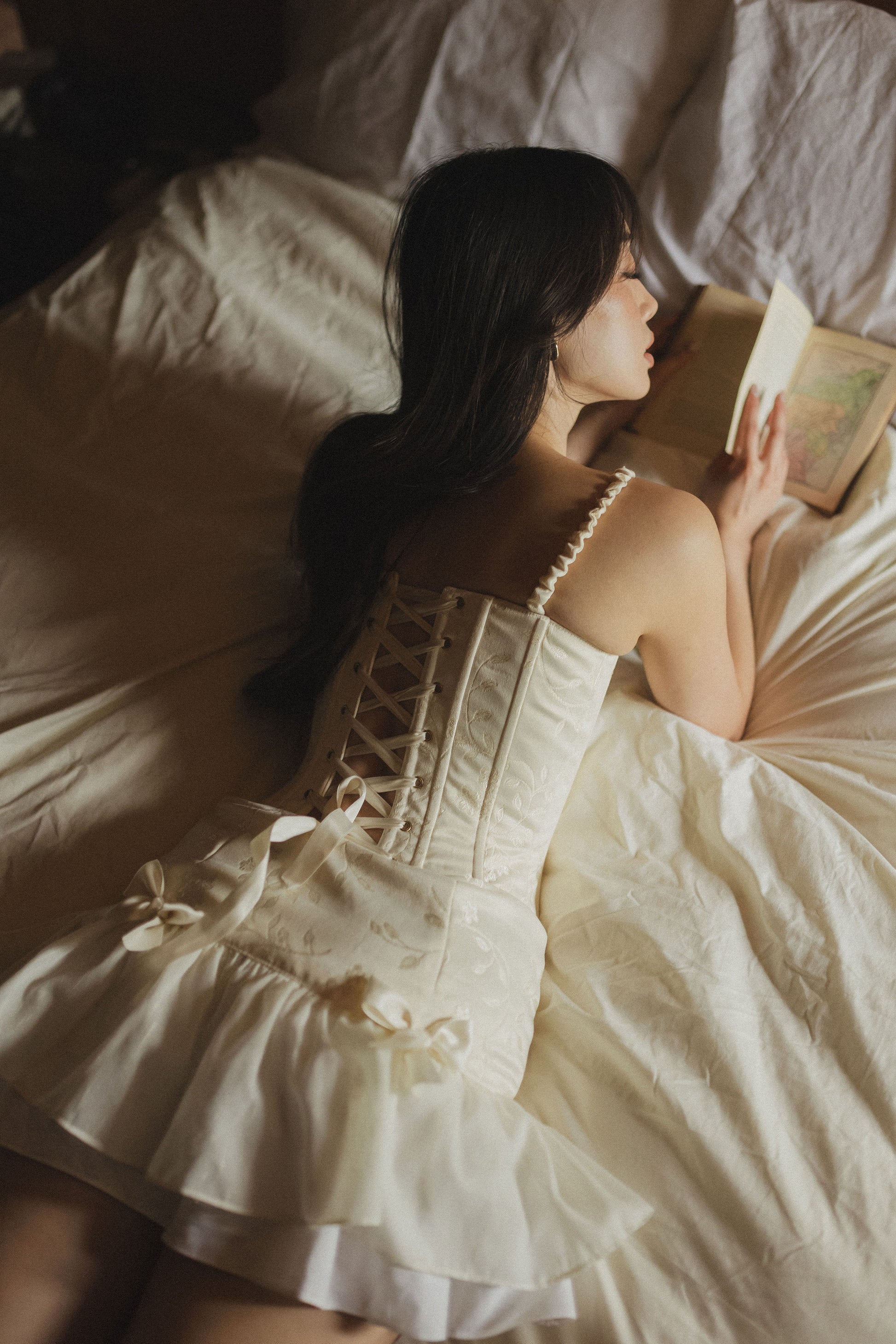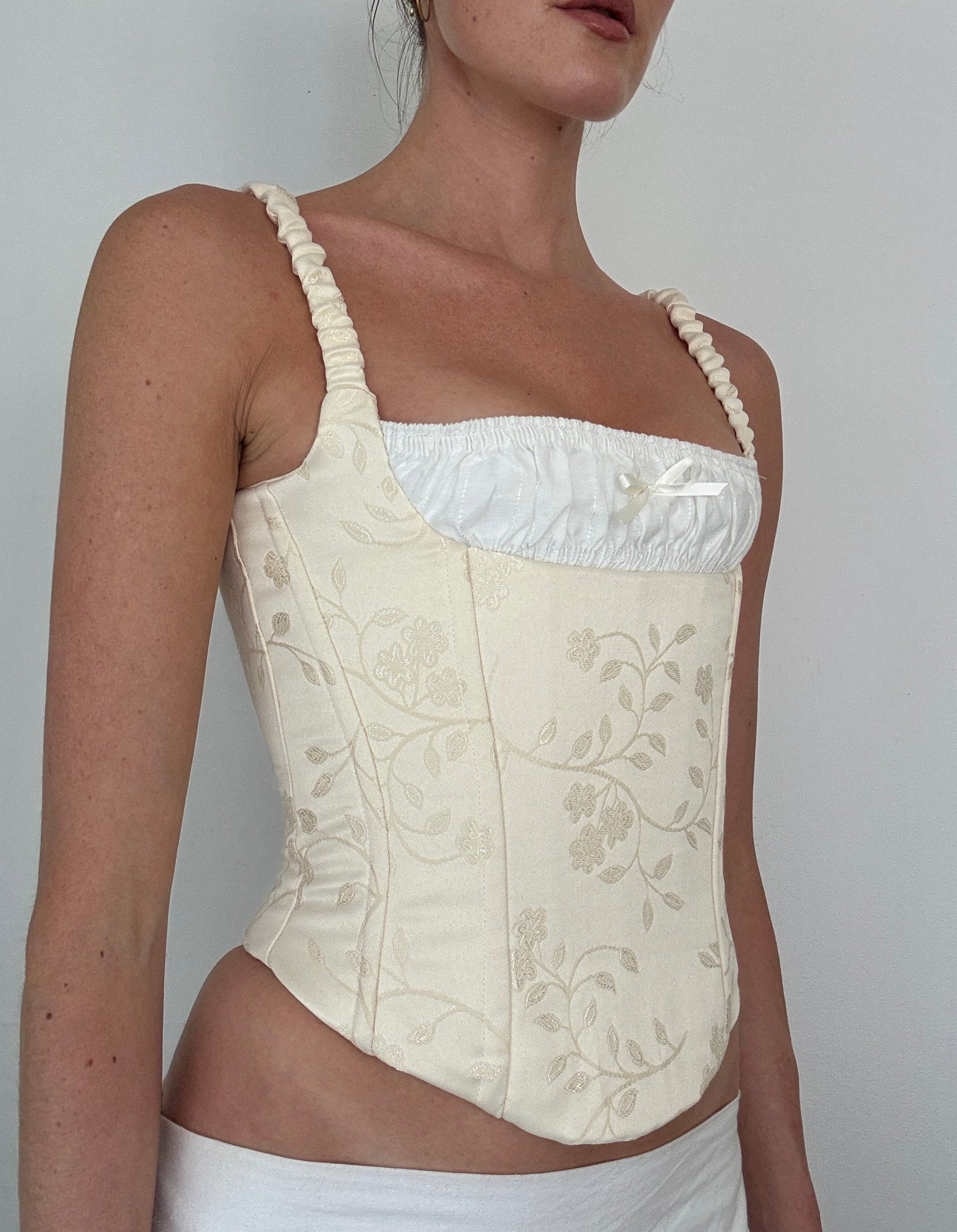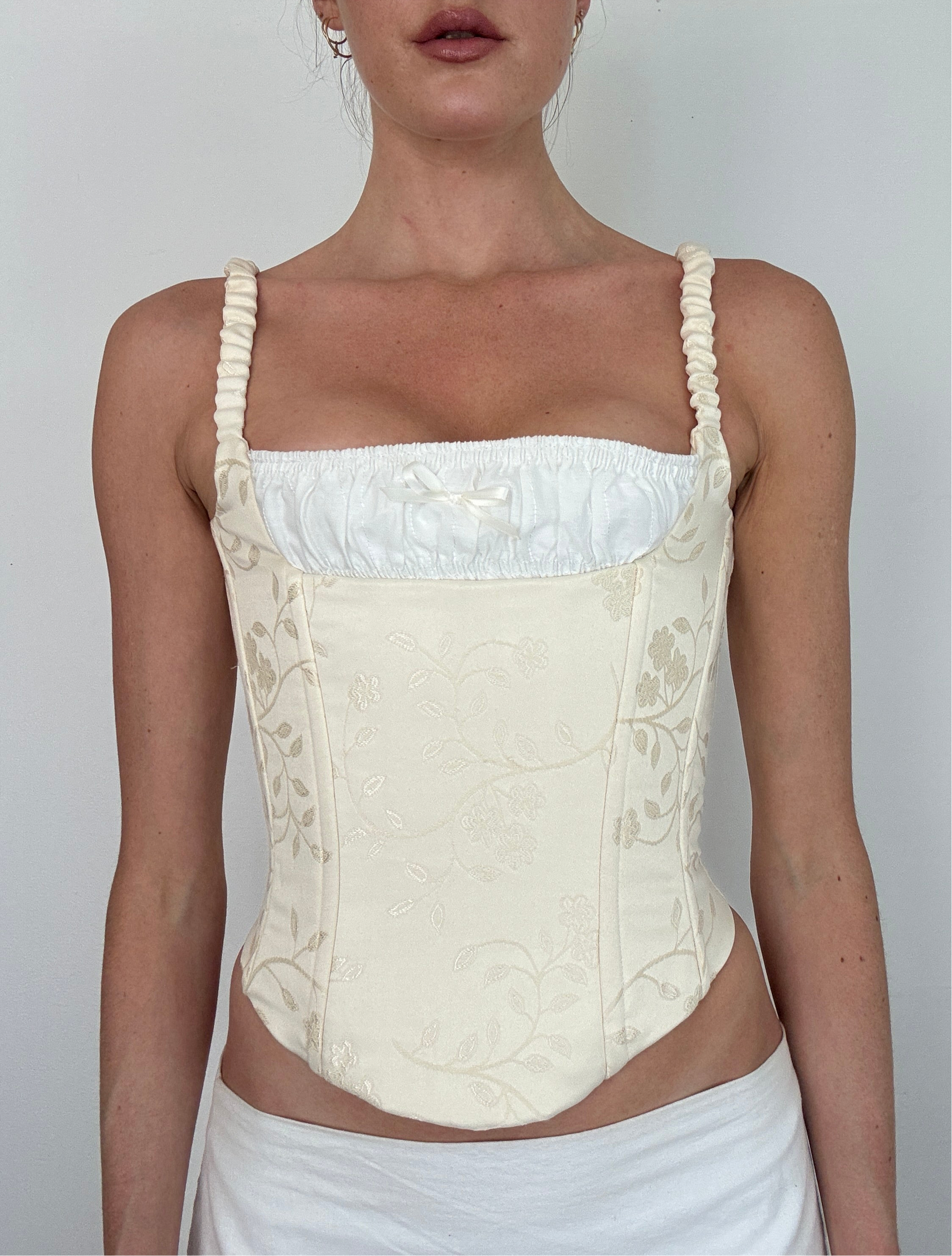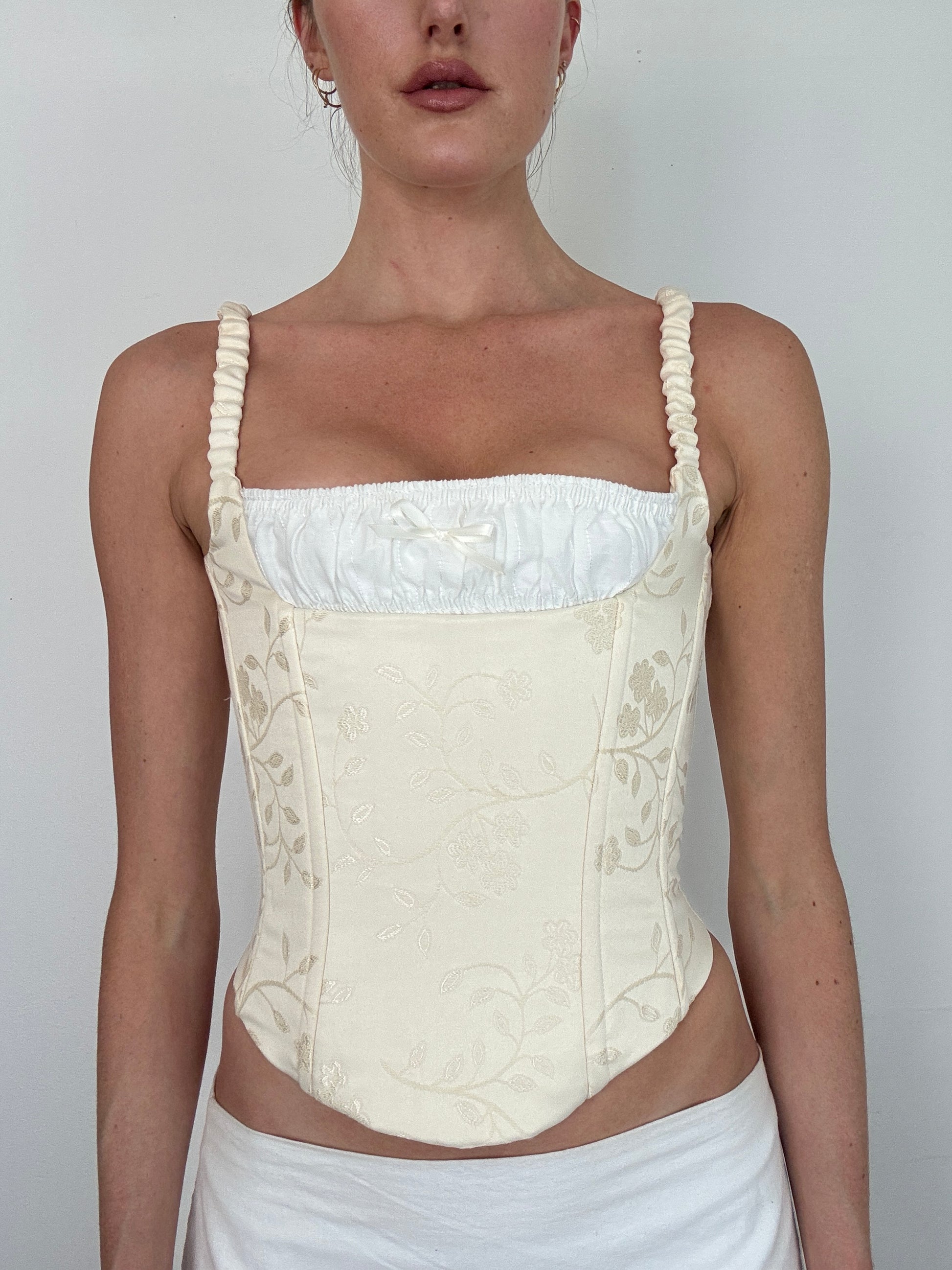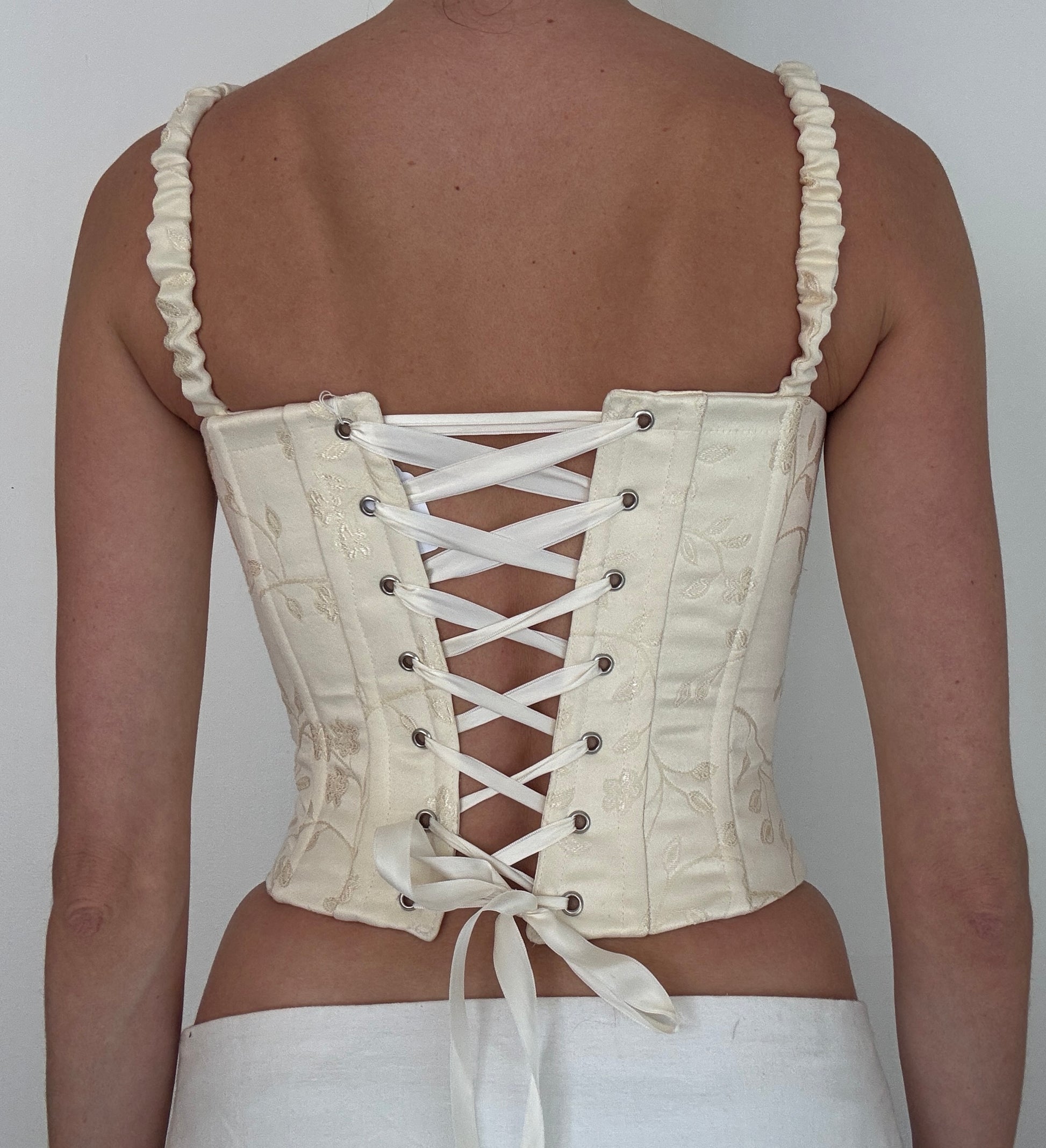 The Sweet Pea corset is a flirty top with a contrast lace scoop style line and bow detailing. This top sits just over your hip bones accentuating the wearers figure with boning and a longer fit. The Sweet Pea has elastic straps and a back adjustable lace up closure for the perfect fit.