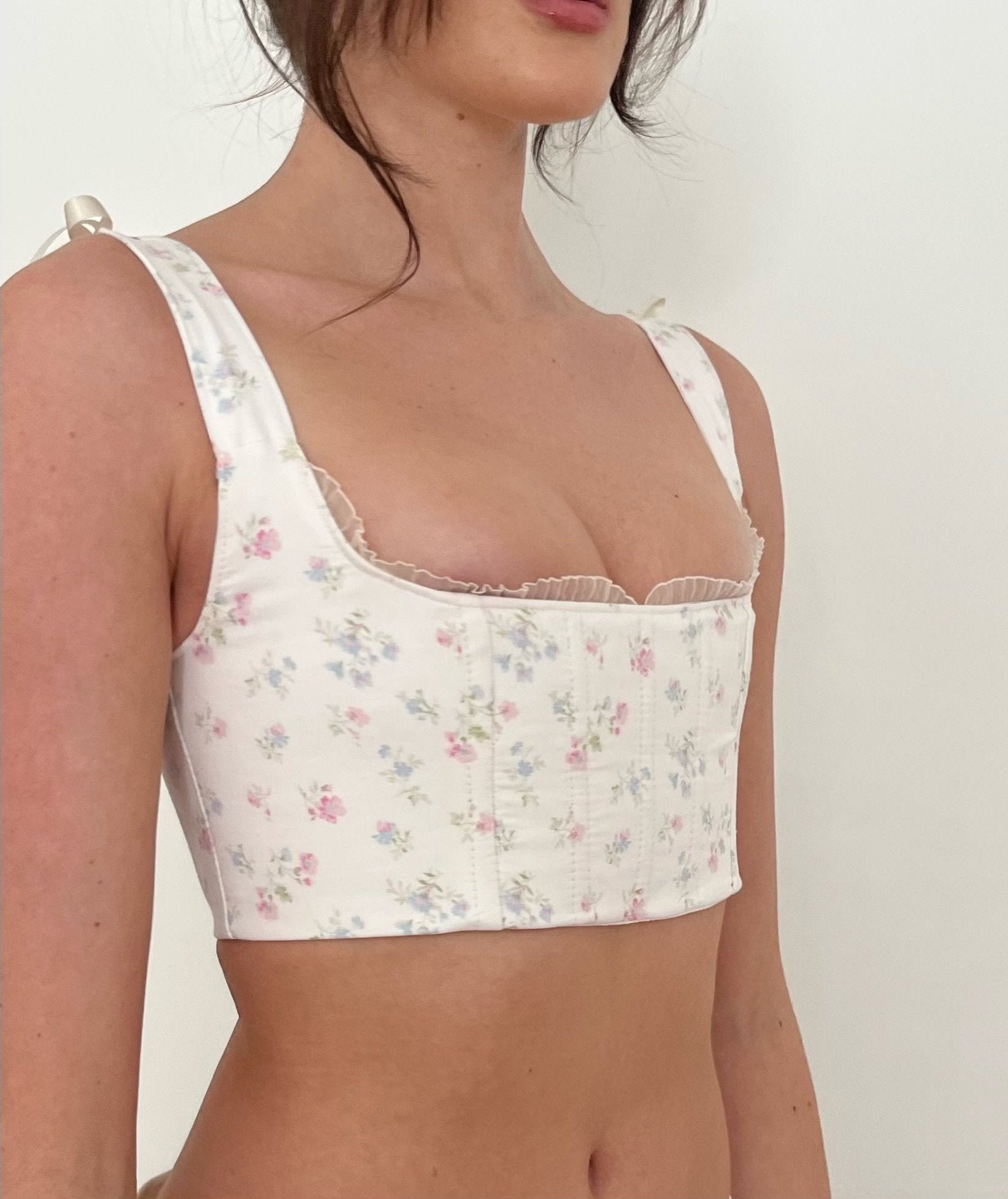 The Tini corset is a flirty styled cropped corset featuring a square styled neckline with pleated chiffon trim detailing. This top has an adjustable lace up back closure and adjustable top tying straps. This flattering top has contouring on the bust and added boning for a supportive fit.