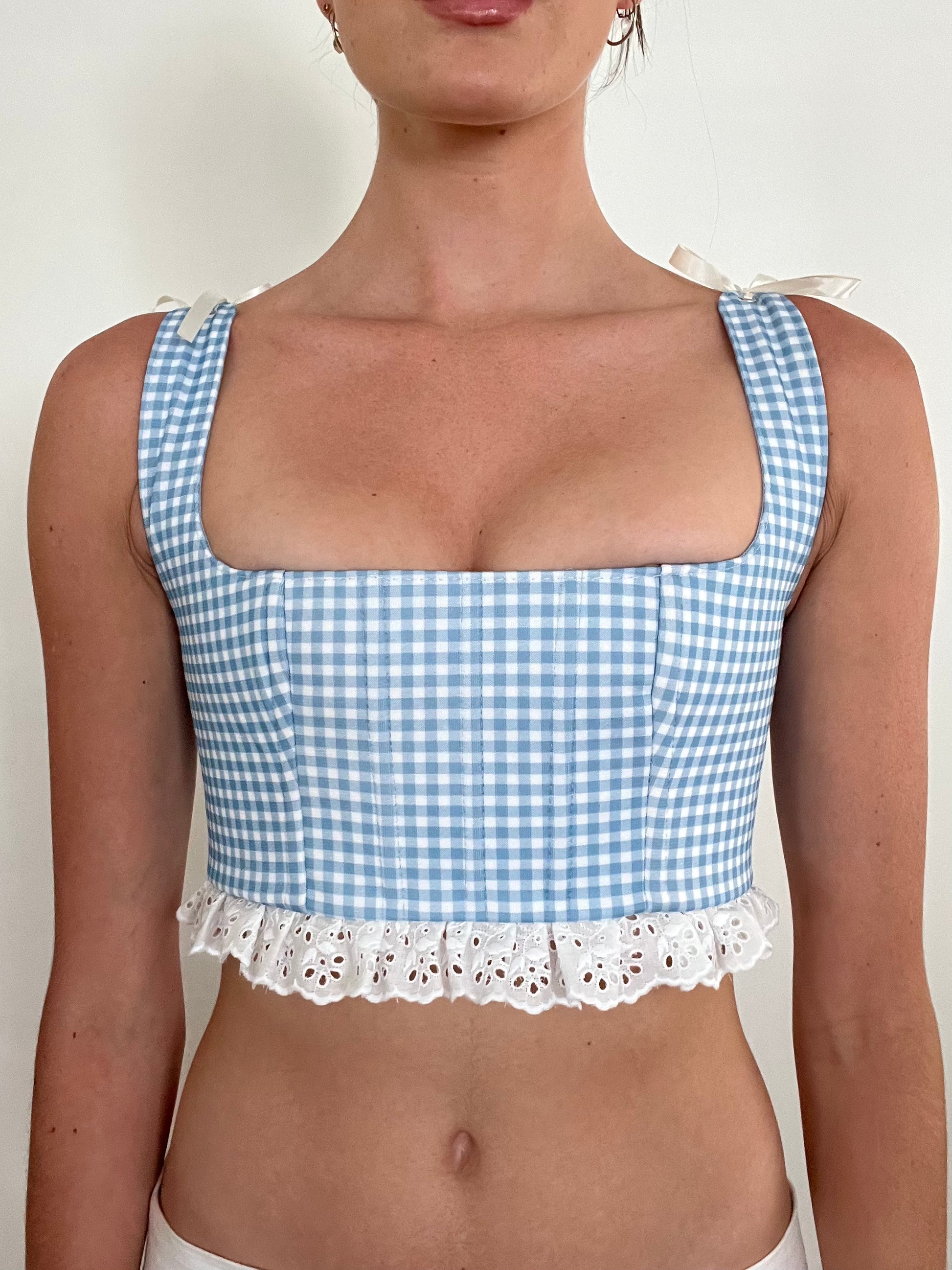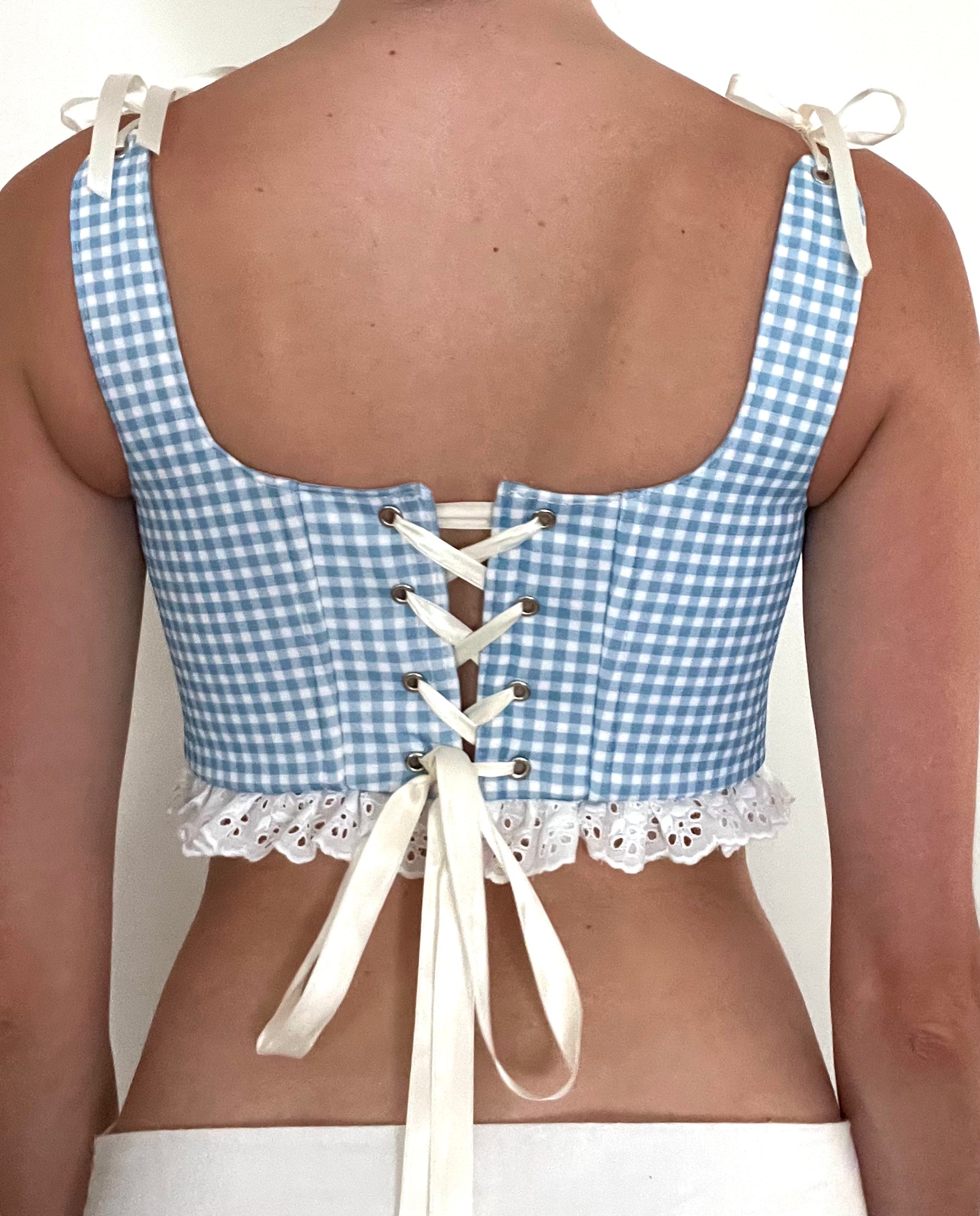 The Tini corset is a flirty styled cropped corset featuring a square styled neckline with lace trim detailing. This top has an adjustable lace up back closure and adjustable top tying straps. This flattering top has contouring on the bust and added boning for a supportive fit.