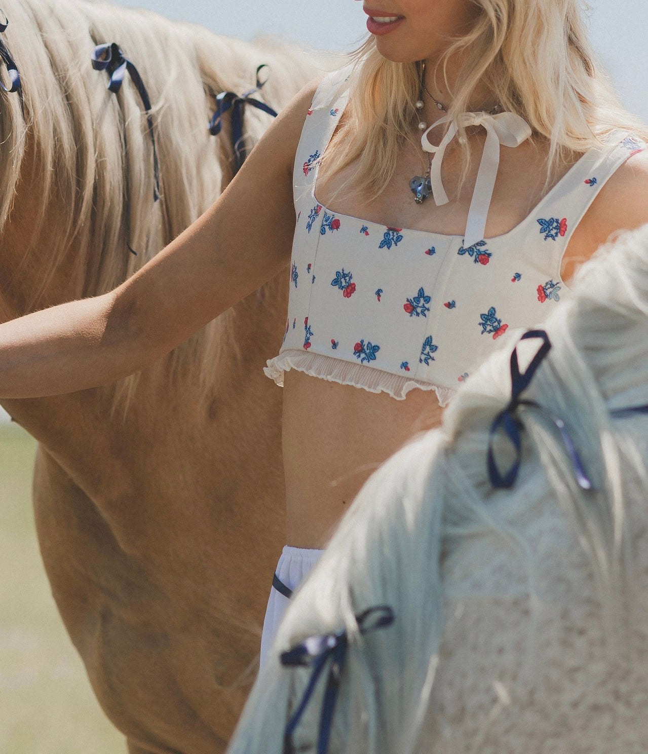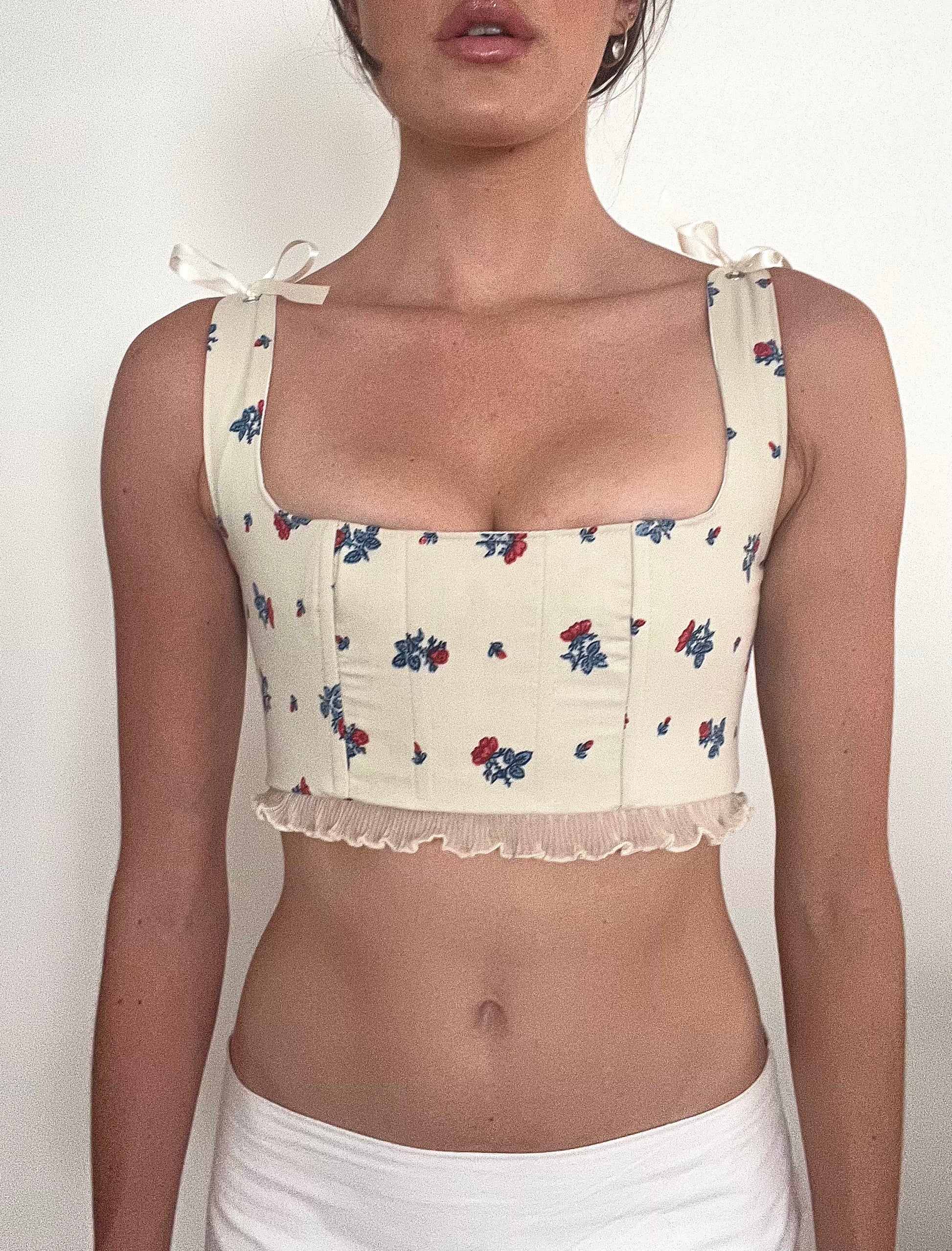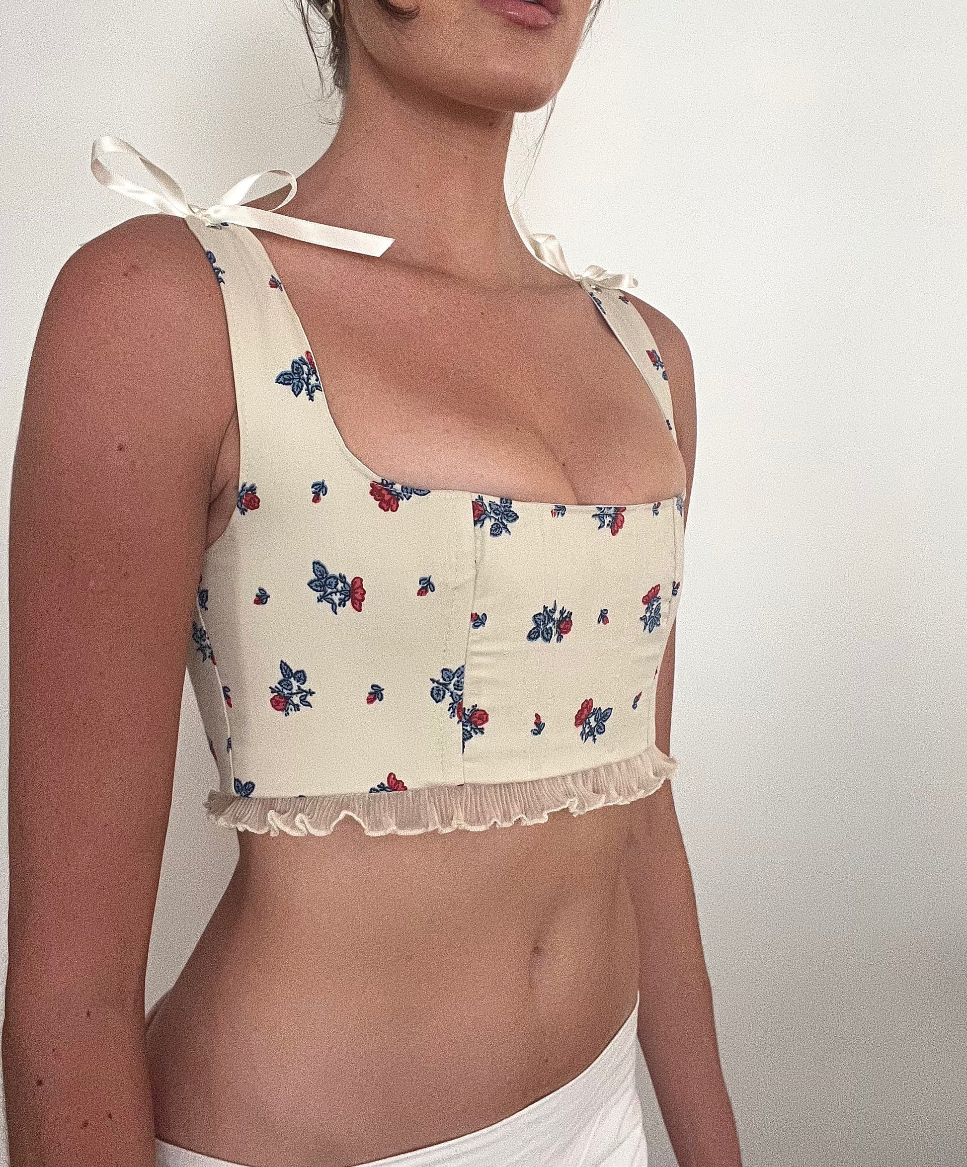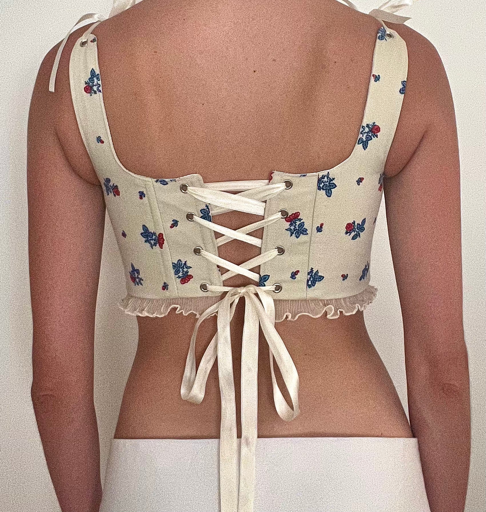 The Tini corset is a flirty styled cropped corset featuring a square styled neckline with pleated chiffon trim detailing. This top has an adjustable lace up back closure and adjustable top tying straps. This flattering top has contouring on the bust and added boning for a supportive fit.